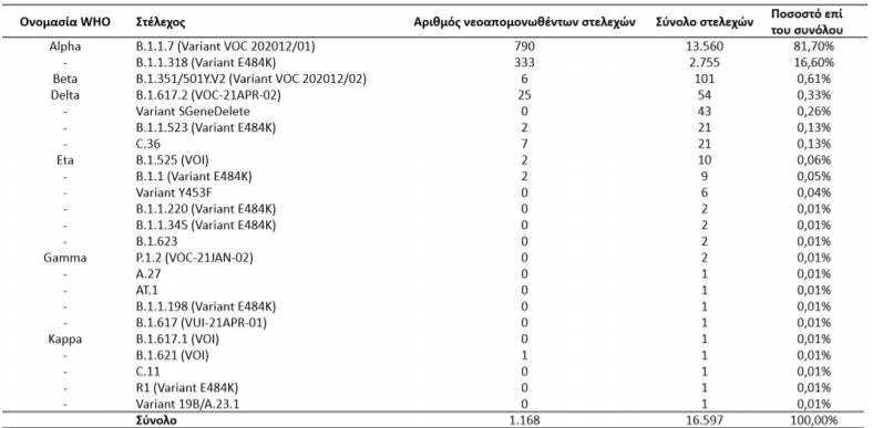 Από τον έλεγχο των 1.201 δειγμάτων, αναδείχθηκαν συνολικά 821 δείγματα με στελέχη ειδικού ενδιαφέροντος (Variants Of Concern - VOC), 340 δείγματα με στελέχη υπό παρακολούθηση (Variants Under Monitoring) και 3 δείγματα με στελέχη ενδιαφέροντος (Variant of Interest - VOI). Εκ των 821 δειγμάτων με στελέχη ειδικού ενδιαφέροντος, τα 790 αφορούν στο στέλεχος Alpha, 6 αφορούν στο Βeta και 25 αφορούν στο Delta. Εκ των 340 δειγμάτων με στελέχη υπό παρακολούθηση, τα 333 αφορούν στο στέλεχος B.1.1.318 (Variant E484K), και 7 αφορούν στο C.36. Εκ των 3 δειγμάτων με στελέχη ενδιαφέροντος, 2 αφορούν στο στέλεχος Eta και 1 δείγμα αφορά στο B.1.621. Επιπλέον, ανιχνεύθηκαν 2 στελέχη B.1.1.523 (Variant E484K) και 2 Β.1.1 (Variant E484K) .