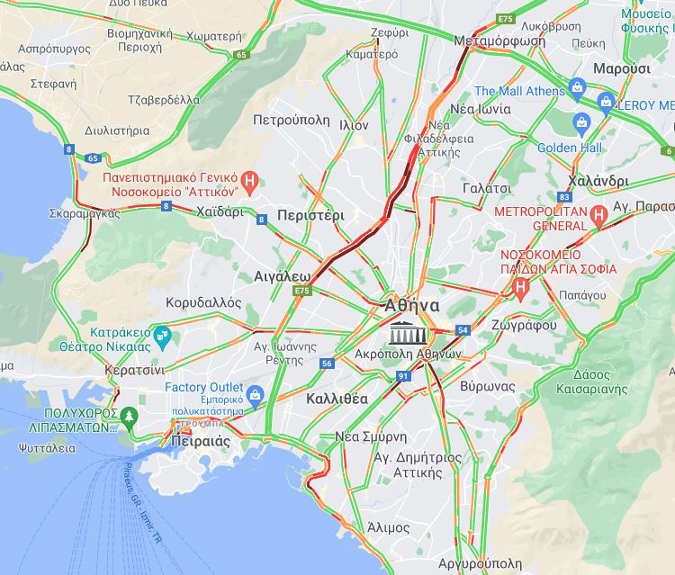 Όπως φαίνεται στον χάρτη της Google για την κίνηση, λίγο πριν τις 8:30 το πρωί στην κάθοδο του Κηφισού υπήρχαν προβλήματα από τη Μεταμόρφωση μέχρι το Αιγάλεω.