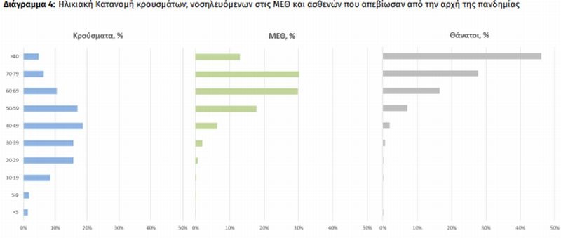 Ακολούθως παρουσιάζεται η ηλικιακή κατανομή των (α) συνολικών κρουσμάτων, (β) των περιστατικών που κατέληξαν σε θάνατο και (γ) των ασθενών που νοσηλεύονται διασωληνωμένοι: