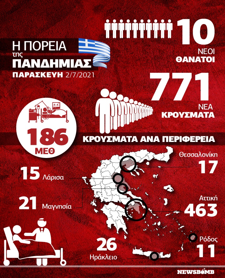 Κρούσματα σήμερα: 771 νέα, 186 διασωληνωμένους και 10 νέους θανάτους ανακοίνωσε ο ΕΟΔΥ