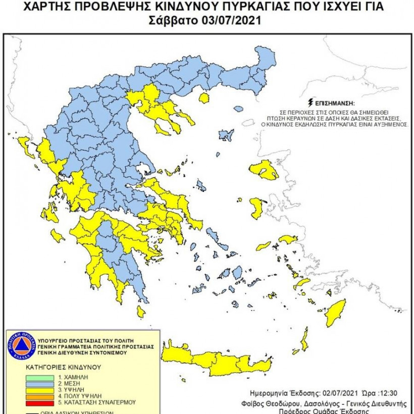Φωτιές στην Ελλάδα - Όλες οι ειδήσεις: Σύμφωνα με το Χάρτη Πρόβλεψης Κινδύνου Πυρκαγιάς που εκδίδει η Γενική Γραμματεία Πολιτικής Προστασίας του Υπουργείου Εσωτερικών και Διοικητικής Ανασυγκρότησης, για σήμερα Σάββατο 3 Ιουλίου, προβλέπεται υψηλός κίνδυνος πυρκαγιάς (κατηγορία κινδύνου 3).
