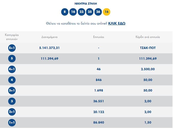 Οι τυχεροί αριθμοί που έβγαλε η κληρωτίδα της αποψινής κλήρωσης είναι οι: 8, 16, 22, 25, 26 και Τζόκερ ο αριθμός 16.