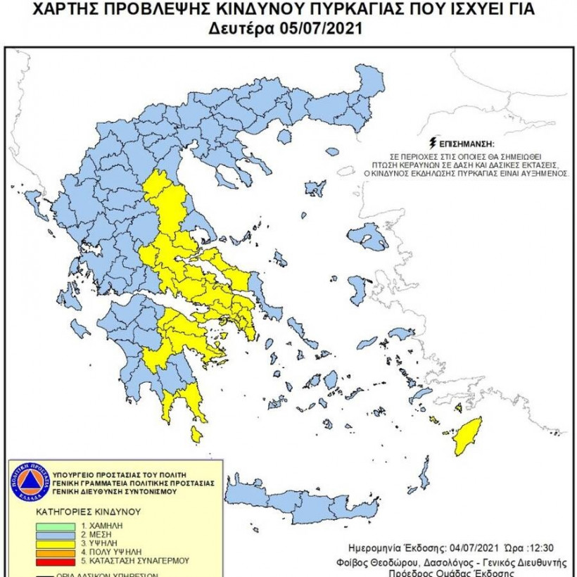 Φωτιές στην Ελλάδα - Όλες οι ειδήσεις: Σύμφωνα με το Χάρτη Πρόβλεψης Κινδύνου Πυρκαγιάς που εκδίδει η Γενική Γραμματεία Πολιτικής Προστασίας του Υπουργείου Εσωτερικών και Διοικητικής Ανασυγκρότησης, για σήμερα Δευτέρα 5 Ιουλίου, προβλέπεται υψηλός κίνδυνος πυρκαγιάς (κατηγορία κινδύνου 3), σε Αττική και Κύθηρα, Βόρεια Εύβοια, περιοχές της Στερεάς Ελλάδας, της Πελοποννήσου, της Θεσσαλίας και σε νησιά της Π.Ε. Ρόδου.