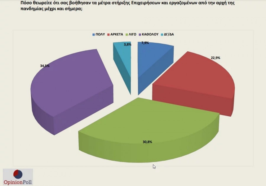 - Μάλιστα, το 31% θεωρεί ότι βοήθησαν τα μέτρα στήριξης Επιχειρήσεων και εργαζομένων από την αρχή της πανδημίας μέχρι και σήμερα από την Κυβέρνηση, ενώ η μεγάλη πλειοψηφία της τάξης του 66% θεωρεί ότι δεν βοήθησαν ικανοποιητικά.
