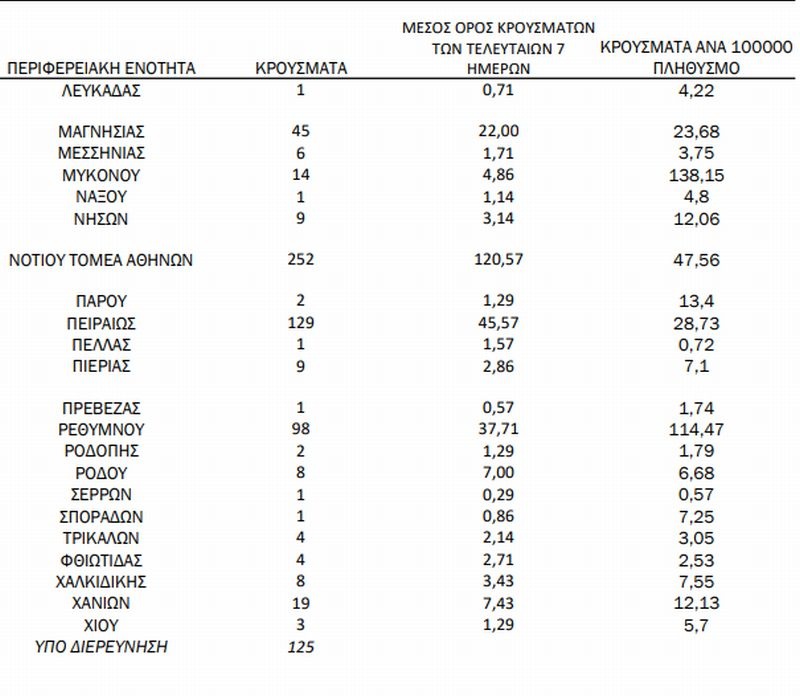 Προβληματισμός επικρατεί και για περιοχές που παρουσιάζουν αυξημένο τον δείκτη κρουσμάτων ανά 100.000 πληθυσμού, όπου το όριο «συναγερμού» είναι ο αριθμός 20. Στα Γρεβενά καταγράφονται 47,23, στο Ηράκλειο 23,57, στη Θήρα 47,66, στη Μαγνησία 23,68, στο Ρέθυμνο 114,47 και στη Μύκονο το εξόχως ανησυχητικό 138,15…