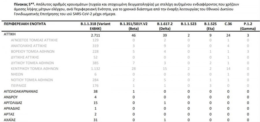 Σημ.2 Στα «Λοιπά Στελέχη Πιθανού Ενδιαφέροντος» περιλαμβάνονται όλα τα στελέχη του πίνακα 3 εκτός των Β.1.1.7 (Alpha), B.1.1.318 (Variant E484K), B.1.351/501Y.V2 (Beta) και B.1.617.2 (Delta).