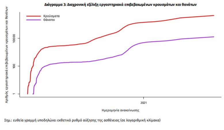Η διαχρονική εξέλιξη των συνολικών κρουσμάτων και συνολικού αριθμού των θανάτων ασθενών COVID-19 παρουσιάζεται στο ακόλουθο διάγραμμα.
