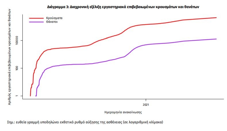 Η διαχρονική εξέλιξη των συνολικών κρουσμάτων και συνολικού αριθμού των θανάτων ασθενών COVID-19 παρουσιάζεται στο ακόλουθο διάγραμμα.