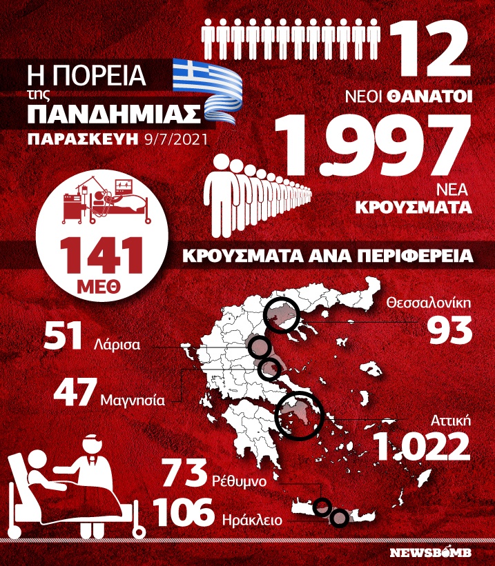 Κρούσματα σήμερα: 1.997 νέα ανακοίνωσε ο ΕΟΔΥ - 12 θάνατοι σε 24 ώρες, 141 οι διασωληνωμένοι