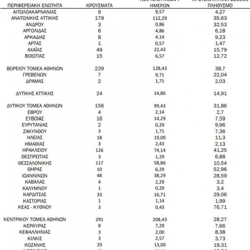 Πίνακας 2: Ημερήσιος αριθμός και κρούσματα ανά 100.000 πληθυσμού επιβεβαιωμένων εγχώριων κρουσμάτων COVID-19 ανά περιφερειακή ενότητα στις 10 Ιουλίου 2021.