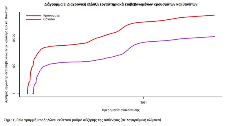 Η διαχρονική εξέλιξη των συνολικών κρουσμάτων και συνολικού αριθμού των θανάτων ασθενών COVID-19 παρουσιάζεται στο ακόλουθο διάγραμμα.