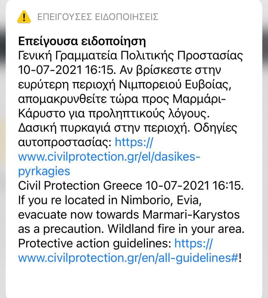 Σημειώνεται ότι λίγο μετά τις 16.00 το απόγευμα του Σαββάτου οι κάτοικοι της ευρύτερης περιοχής στην Εύβοια είδαν στα κινητά τους ένα μήνυμα από το 112 που έγραφε «Αν βρίσκεστε στην ευρύτερη περιοχή Νημποριό Ευβοίας, απομακρυνθείτε τώρα προς Μαρμάρι - Κάρυστο για προληπτικούς λόγους. Δασική πυρκαγιά στην περιοχή».