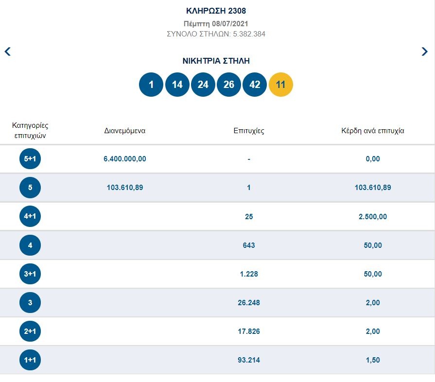 Υπενθυμίζεται ότι οι αριθμοί που έβγαλε η κληρωτίδα της περασμένης κλήρωσης (2308) ήταν οι: 1, 14, 24, 26, 42 και Τζόκερ ο αριθμός 11.
