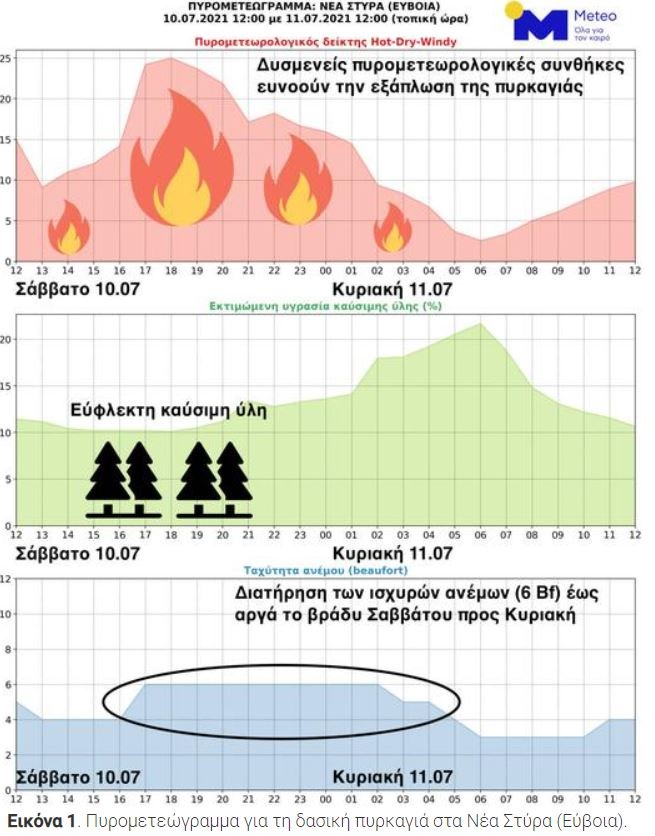 Ειδικότερα, η πυρκαγιά στα Νέα Στύρα εκδηλώθηκε νωρίς το μεσημέρι, με την έναρξη της να συμπίπτει με σημαντική επιδείνωση των πυρομετεωρολογικών συνθηκών. Με βάση τις επιχειρησιακές προγνώσεις υψηλής ανάλυσης του ΕΑΑ - meteo.gr, οι δυσμενείς πυρομετεωρολογικές συνθήκες (υψηλή θερμοκρασία, χαμηλή υγρασία καύσιμης ύλης, ισχυροί άνεμοι), αναμένεται να διατηρηθούν έως και αργά το βράδυ του Σαββάτου (10.07.2021) προς Κυριακή (11.07.2021).