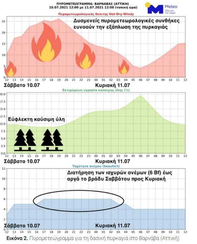 Σε ό,τι αφορά τη δασική πυρκαγιά στον Βαρνάβα, και σε αυτή την περίπτωση, η εκδήλωση της έλαβε χώρα κατά τη διάρκεια επιδεινούμενων πυρομετεωρολογικών συνθηκών. Σύμφωνα με τις επιχειρησιακές προγνώσεις υψηλής ανάλυσης του ΕΑΑ - meteo.gr, οι δυσμενείς πυρομετεωρολογικές συνθήκες αναμένεται να διατηρηθούν έως το βράδυ του Σαββάτου (10.07.2021), με την ένταση του ανέμου ωστόσο, να υποχωρεί νωρίς το ξημέρωμα της Κυριακής (11.07.2021).