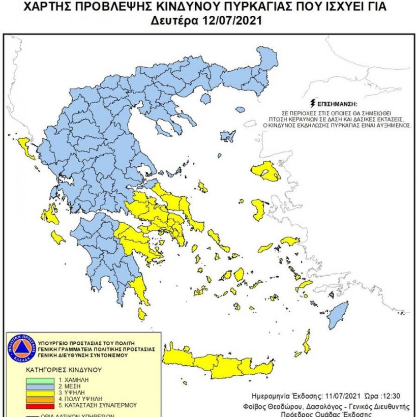 Δείτε στο χάρτη, τις περιοχές που αντιμετωπίζουν υψηλό κίνδυνο σήμερα Δευτέρα 12 Ιουλίου