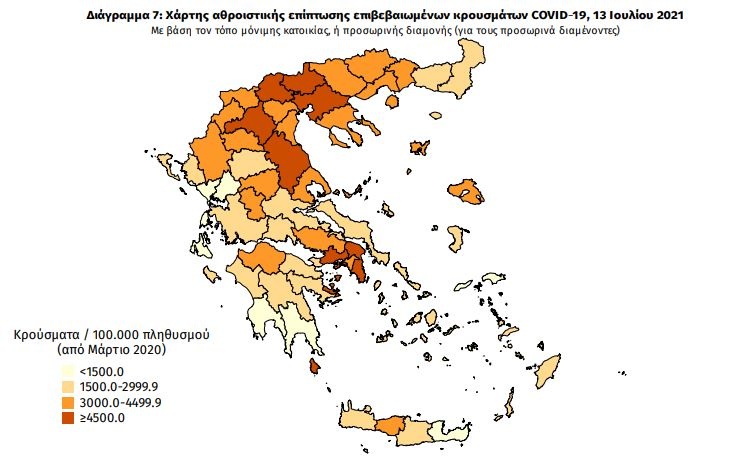 Γεωγραφική διασπορά: Ο χάρτης αποτυπώνει τη γεωγραφική κατανομή των συνολικών κρουσμάτων COVID-19 (από την αρχή της επιδημίας) ανά Περιφερειακή Ενότητα της χώρας, με βάση την δηλωθείσα διεύθυνση μόνιμης κατοικίας του ασθενούς, ή τη διεύθυνση προσωρινής διαμονής για τους τουρίστες και άλλους προσωρινά διαμένοντες στην Ελλάδα.