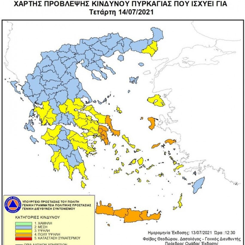 Φωτιές στην Ελλάδα - Όλες οι ειδήσεις: Σύμφωνα με το Χάρτη Πρόβλεψης Κινδύνου Πυρκαγιάς που εκδίδει η Γενική Γραμματεία Πολιτικής Προστασίας του Υπουργείου Εσωτερικών και Διοικητικής Ανασυγκρότησης, για σήμερα Τετάρτη 14 Ιουλίου, προβλέπεται πολύ υψηλός κίνδυνος πυρκαγιάς (κατηγορία κινδύνου 4).
