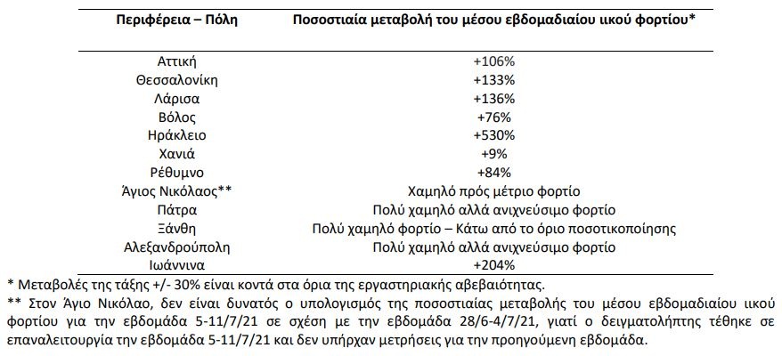 Την εβδομάδα 5 έως 11 Ιουλίου 2021, παρατηρήθηκαν αυξητικές τάσεις, σε σχέση με την εβδομάδα 28 Ιουνίου έως 4 Ιουλίου 2021, στο ιικό φορτίο του SARS-CoV-2 στα αστικά λύματα των επτά από τις δώδεκα (7/12) περιοχές που ελέγχθηκαν από το Εθνικό Δίκτυο Επιδημιολογίας Λυμάτων του ΕΟΔΥ. Οι αυξητικές μεταβολές κυμάνθηκαν από +76% στο Βόλο έως +530% στο Ηράκλειο. Σταθερό παρέμεινε το ιικό φορτίο στα Χανιά (+9%).