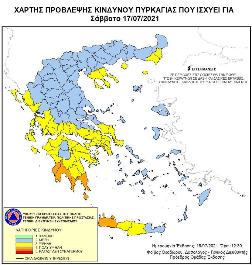 Φωτιές στην Ελλάδα - Όλες οι ειδήσεις: Υψηλός κίνδυνος πυρκαγιάς για πέντε περιοχές της επικράτειας εκτιμά η Γενική Γραμματεία Πολιτικής Προστασίας για αύριο Σάββατο 17/07