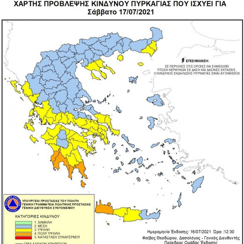 Δείτε στο χάρτη, τις περιοχές που αντιμετωπίζουν υψηλό κίνδυνο σήμερα Σάββατο 17 Ιουλίου
