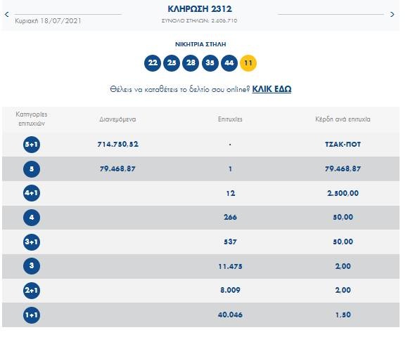Οι τυχεροί αριθμοί που έβγαλε η κληρωτίδα της αποψινής κλήρωσης είναι οι: 22, 25, 28, 35, 44 και τζόκερ ο αριθμός 11.