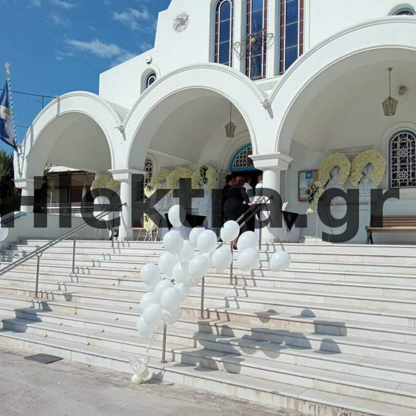 Λευκά μπαλόνια και στεφάνια βρίσκονταν στα σκαλιά της εκκλησίας ενώ μοιράστηκαν και λευκές μπομπονιέρες.
