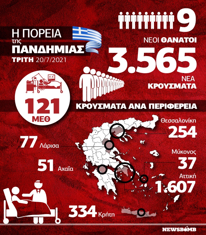 Κρούσματα σήμερα: 3.565 νέα ανακοίνωσε ο ΕΟΔΥ - 9 νεκροί σε 24 ώρες, στους 121 οι διασωληνωμένοι