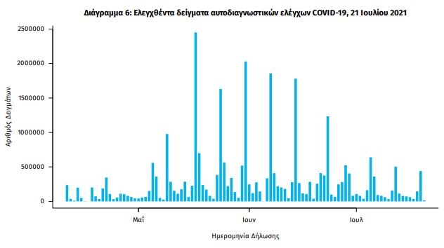 Στις 20 Ιουλίου 2021, πραγματοποιήθηκαν 135 δράσεις δειγματοληπτικών ελέγχων από τις Κινητές Ομάδες Υγείας (ΚΟΜΥ) του ΕΟΔΥ, στις οποίες διενεργήθηκαν 21.641 έλεγχοι Rapid Ag και ανευρέθηκαν 500 θετικά (2,31%).