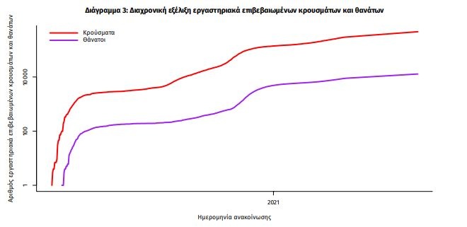 Η διαχρονική εξέλιξη των συνολικών κρουσμάτων και συνολικού αριθμού των θανάτων ασθενών COVID-19 παρουσιάζεται στο ακόλουθο διάγραμμα.