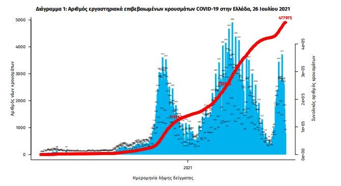 Κορονοϊός - Όλες οι ειδήσεις: Τη Δευτέρα, 26 Ιουλίου 2021, ο ΕΟΔΥ ανακοίνωσε, 2.070 νέα κρούσματα του νέου ιού στη χώρα, εκ των οποίων τα 13 εντοπίστηκαν σε ελέγχους στις πύλες εισόδου της χώρας.