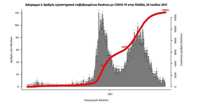Οι νέοι θάνατοι ασθενών με Covid-19 είναι 5, ενώ από την έναρξη της επιδημίας έχουν καταγραφεί συνολικά 12.903 θάνατοι. Το 95,1% είχε υποκείμενο νόσημα ή/και ηλικία 70 ετών και άνω.