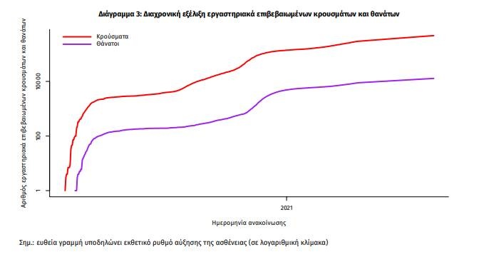 Η διαχρονική εξέλιξη των συνολικών κρουσμάτων και συνολικού αριθμού των θανάτων ασθενών COVID-19 παρουσιάζεται στο ακόλουθο διάγραμμα.