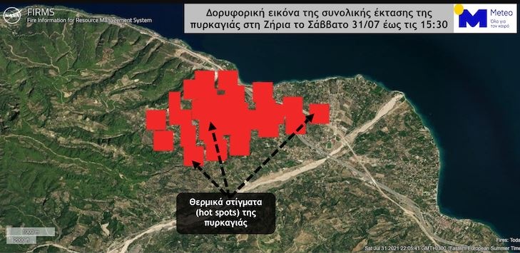 Δορυφορικές εικόνες από τους δορυφόρους της NASA απεικονίζουν την μεγάλη ένταση και έκταση της πυρκαγιάς που ξέσπασε κοντά στη Ζήρια, Αχαΐας σήμερα το μεσημέρι του Σαββάτου (31/7).