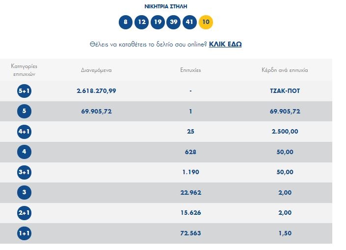 Αξίζει να σημειωθεί ότι στην δεύτερη κατηγορία (5αρια) βρέθηκε ένα επιτυχημένο δελτίο που κερδίζει 69.905,72 ευρώ!