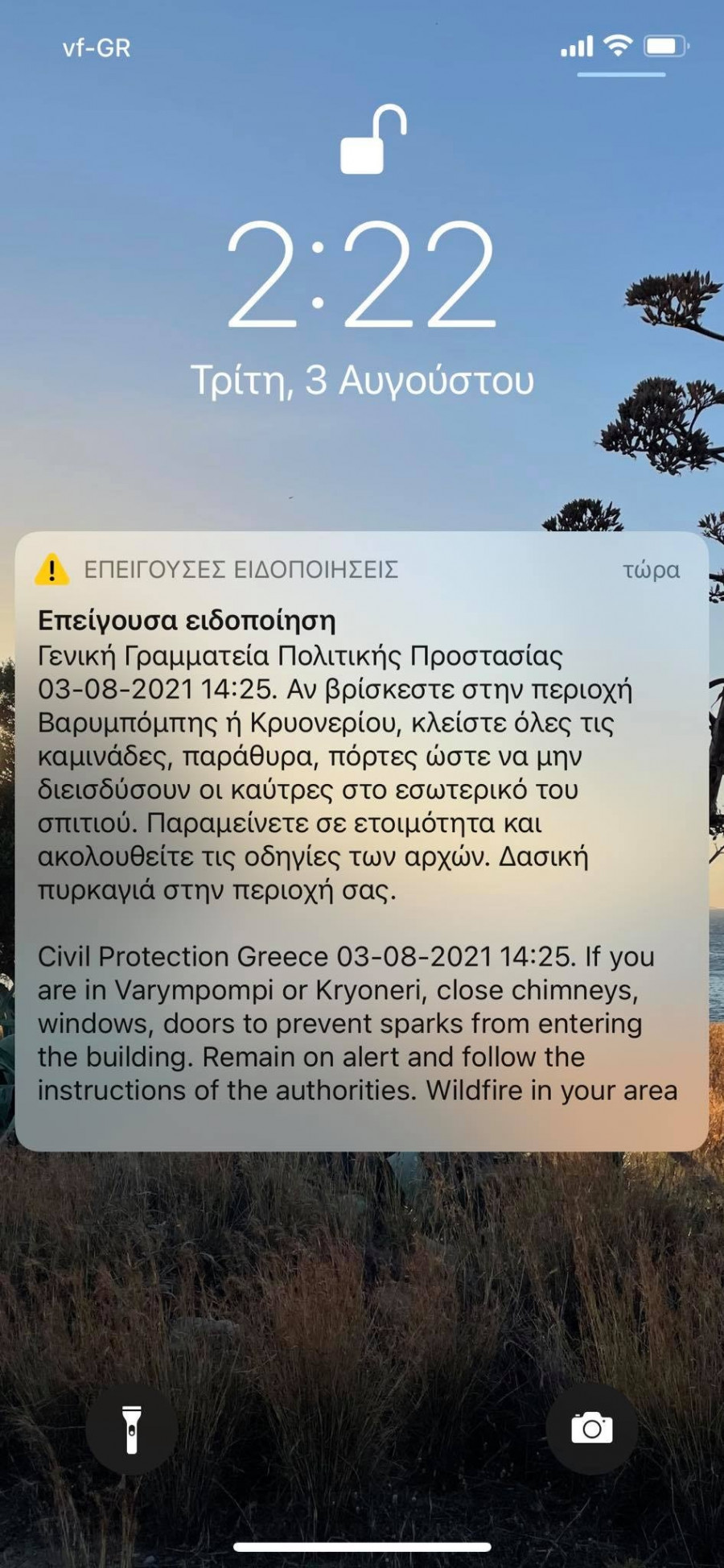 «Παραμείνετε σε ετοιμότητα και ακολουθείτε τις οδηγίες των αρχών. Δασική πυρκαγιά στην περιοχή σας» καταλήγει το μήνυμα.