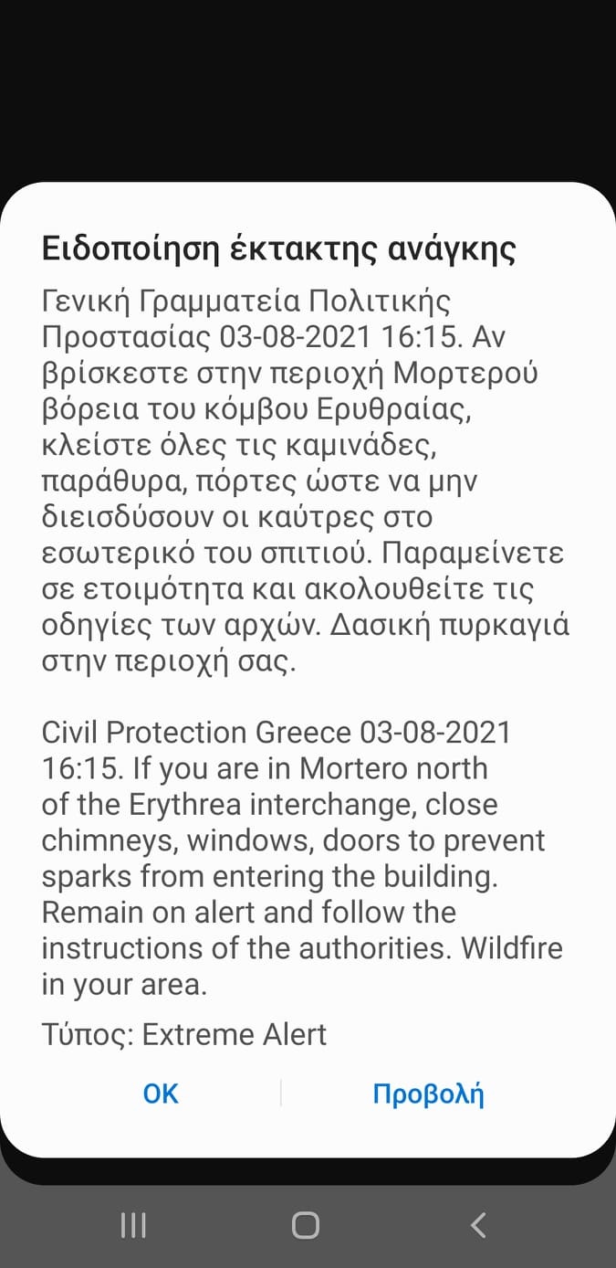 Το μήνυμα καλεί τους κατοίκους να κλείσουν πόρτες, παράθυρα και καμινάδες και να παραμείνουν σε ετοιμότητα.