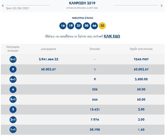 Αξίζει να σημειωθεί ότι στην δεύτερη κατηγορία (5αρια) βρέθηκε ένα επιτυχημένο δελτίο που κερδίζει 50.002 ευρώ!