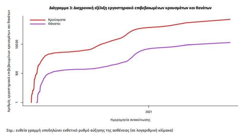 Η διαχρονική εξέλιξη των συνολικών κρουσμάτων και συνολικού αριθμού των θανάτων ασθενών COVID-19 παρουσιάζεται στο ακόλουθο διάγραμμα.