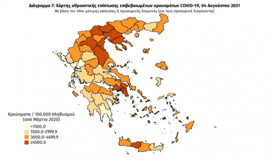 Γεωγραφική διασπορά: Ο χάρτης αποτυπώνει τη γεωγραφική κατανομή των συνολικών κρουσμάτων COVID-19 (από την αρχή της επιδημίας) ανά Περιφερειακή Ενότητα της χώρας, με βάση την δηλωθείσα διεύθυνση μόνιμης κατοικίας του ασθενούς, ή τη διεύθυνση προσωρινής διαμονής για τους τουρίστες και άλλους προσωρινά διαμένοντες στην Ελλάδα.