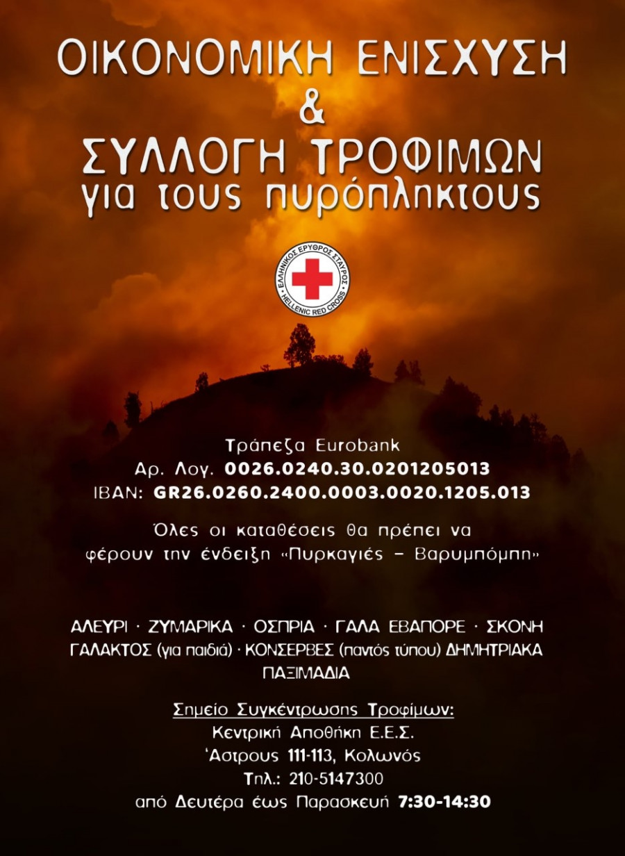 Ο Ελληνικός Ερυθρός Σταυρός, αναγνωρίζοντας την κρισιμότητα της κατάστασης και τις τεράστιες ανάγκες που έχουν προκύψει από τις μεγάλης έκτασης φωτιές σε Βαρυμπόμπη, Πάτρα, Ρόδο, Β. Εύβοια, Αρχαία Ολυμπία, διευρύνει το κάλεσμα του στον κόσμο για συγκέντρωση χρημάτων και τροφίμων προς τους πυρόπληκτους όλων των παραπάνω περιοχών.