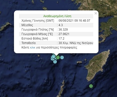 Σεισμική δόνηση 4,3 βαθμών Ρίχτερ σημειώθηκε, στις 12:16, με επίκεντρο τον θαλάσσιο χώρο ανοιχτά πόλης της Νισύρου.