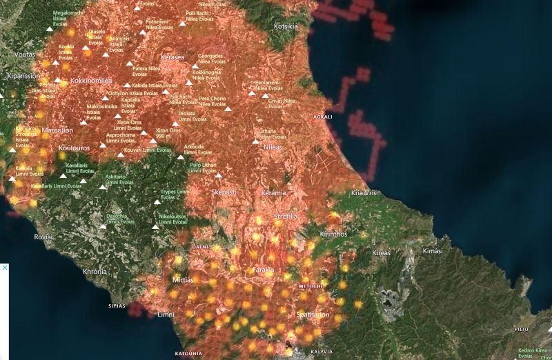 Αυτή την ώρα, το μέτωπο κινείται προς τα Καλύβια, τον Τρούπη και το Προκόπι, με την Εύβοια να έχει καλυφθεί από καπνούς και να ζει έναν απίστευτο εφιάλτη.