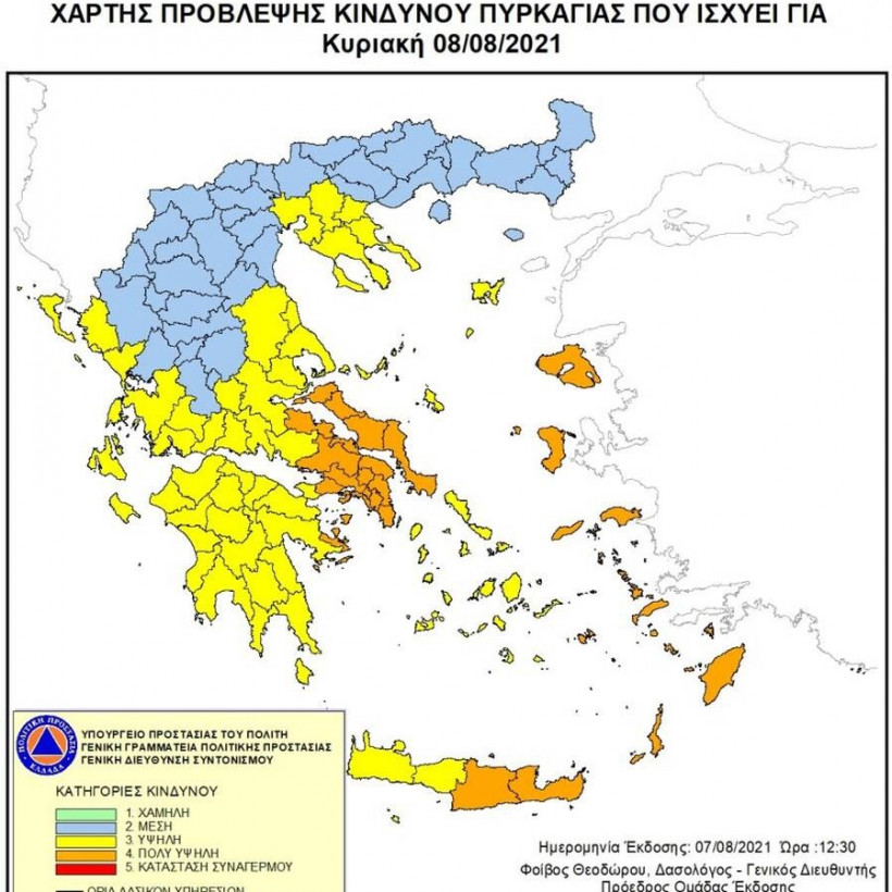 Φωτιές στην Ελλάδα - Όλες οι ειδήσεις: Σύμφωνα με το Χάρτη Πρόβλεψης Κινδύνου Πυρκαγιάς που εκδίδει η Γενική Γραμματεία Πολιτικής Προστασίας του Υπουργείου Εσωτερικών και Διοικητικής Ανασυγκρότησης, για σήμερα Κυριακή 8 Αυγούστου, προβλέπεται πολύ υψηλός κίνδυνος πυρκαγιάς (κατηγορία κινδύνου 4).