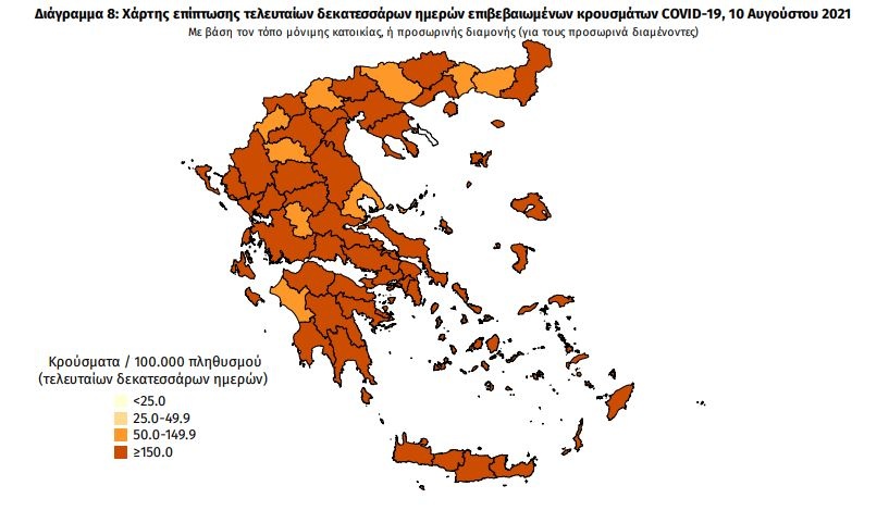 Ημερήσιος αριθμός και κρούσματα ανά 100.000 πληθυσμού επιβεβαιωμένων εγχώριων κρουσμάτων COVID-19 ανά περιφερειακή ενότητα στις 10 Αυγούστου 2021.