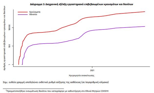 Η διαχρονική εξέλιξη των συνολικών κρουσμάτων και συνολικού αριθμού των θανάτων ασθενών COVID-19 παρουσιάζεται στο ακόλουθο διάγραμμα.