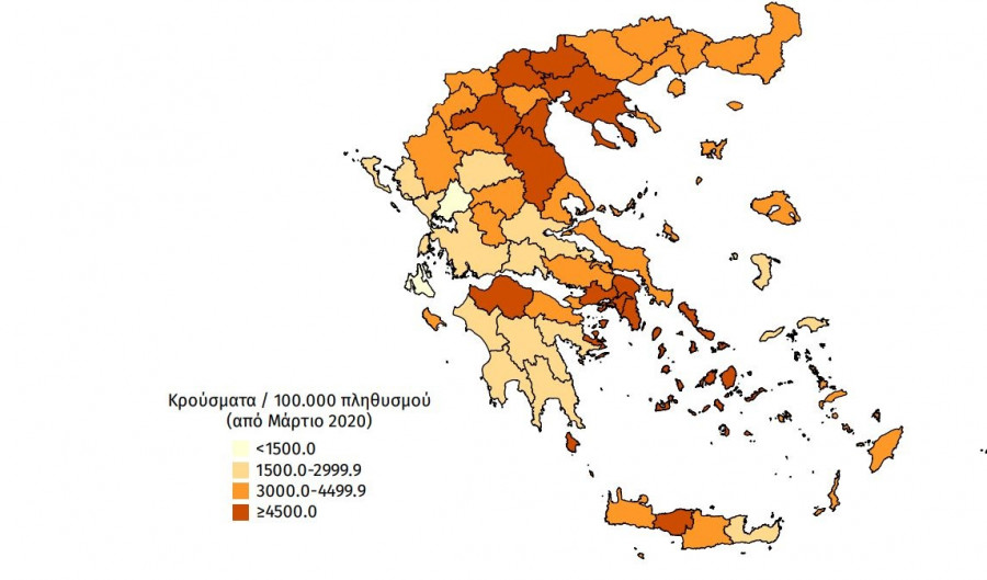 Γεωγραφική διασπορά: Ο χάρτης αποτυπώνει τη γεωγραφική κατανομή των συνολικών κρουσμάτων COVID-19 (από την αρχή της επιδημίας) ανά Περιφερειακή Ενότητα της χώρας, με βάση την δηλωθείσα διεύθυνση μόνιμης κατοικίας του ασθενούς, ή τη διεύθυνση προσωρινής διαμονής για τους τουρίστες και άλλους προσωρινά διαμένοντες στην Ελλάδα. Συμπεριλαμβάνονται τόσο κρούσματα με ιστορικό ταξιδίου (“εισαγόμενα”) όσο και κρούσματα με πιθανή εγχώρια μετάδοση.