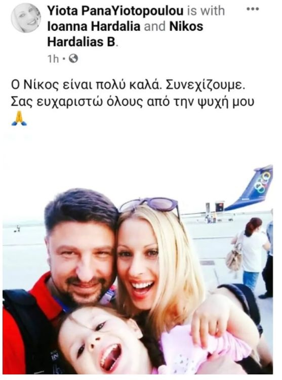 Παράλληλα, η σύζυγος του κύριου Χαρδαλιά, Γιώτα Παναγιωτοπούλου, με ανάρτησή της στα social media ανέφερε ότι είναι καλά στην υγεία του και ευχαρίστησε για τη συμπαράσταση.