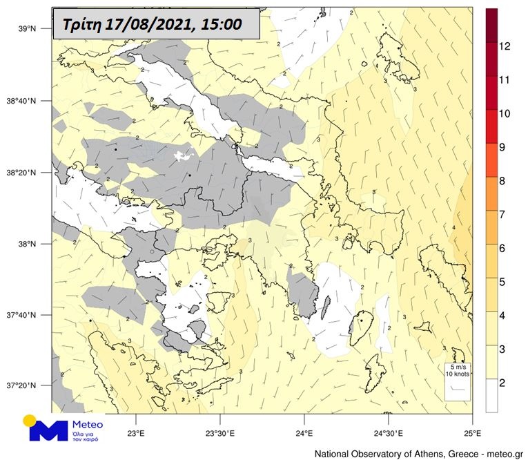 Όσον αφορά την εξέλιξη των ανέμων στην περιοχή, σύμφωνα με τα τελευταία προγνωστικά δεδομένα του Εθνικού Αστεροσκοπείου Αθηνών / meteo.gr, θα πνέουν αρχικά από μεταβαλλόμενες διευθύνσεις έως 2 μποφόρ, από το μεσημέρι θα στραφούν σε νότιους έως 2 και τοπικά έως 3 μποφόρ και προς το βράδυ θα στραφούν σε βορειοδυτικούς έως 2 και τοπικά έως 3 μποφόρ.