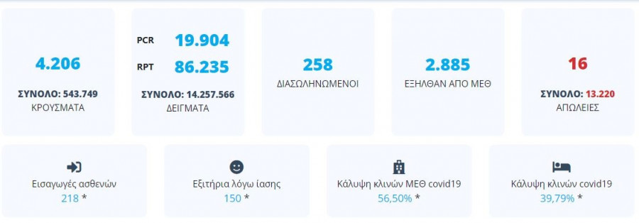 Κρούσματα σήμερα: 4.206 νέα ανακοίνωσε ο ΕΟΔΥ - 16 νεκροί σε 24 ώρες, στους 258 οι διασωληνωμένοι